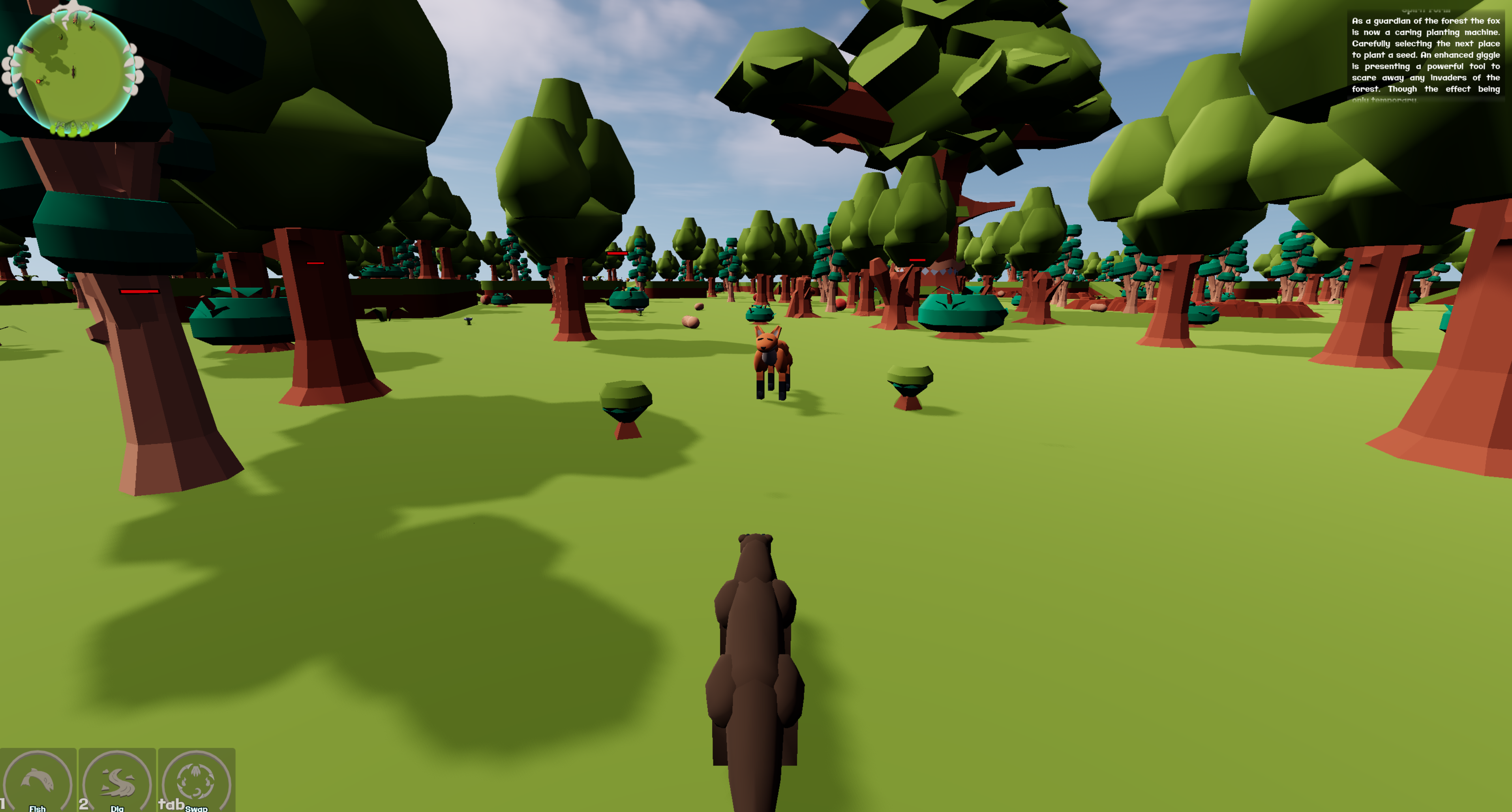 Collect Seeds, plant trees, defeat humans, who seek to harvest your forest! Guardian of the Forest is a 3D Tower Defense in which you play a combination of unique animals. Each animal has its own set of abilities. The goal is to surround the Spirit Tree, in the center of the map, with a river. You loose if the Spirit Tree dies.